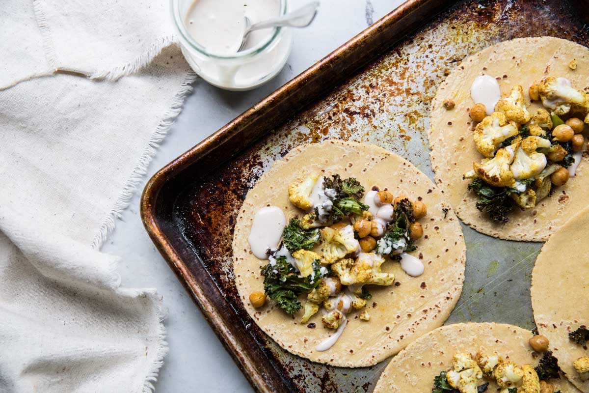 Cauliflower, Chickpea and Crispy Kale Tacos with Orange Tahini Sauce