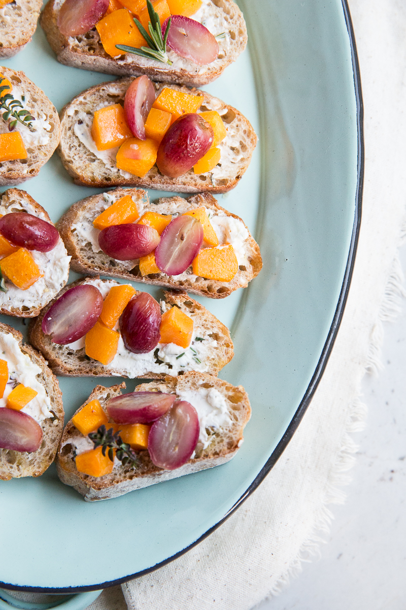 Roasted butternut squash and grapes are great on top of crostini.